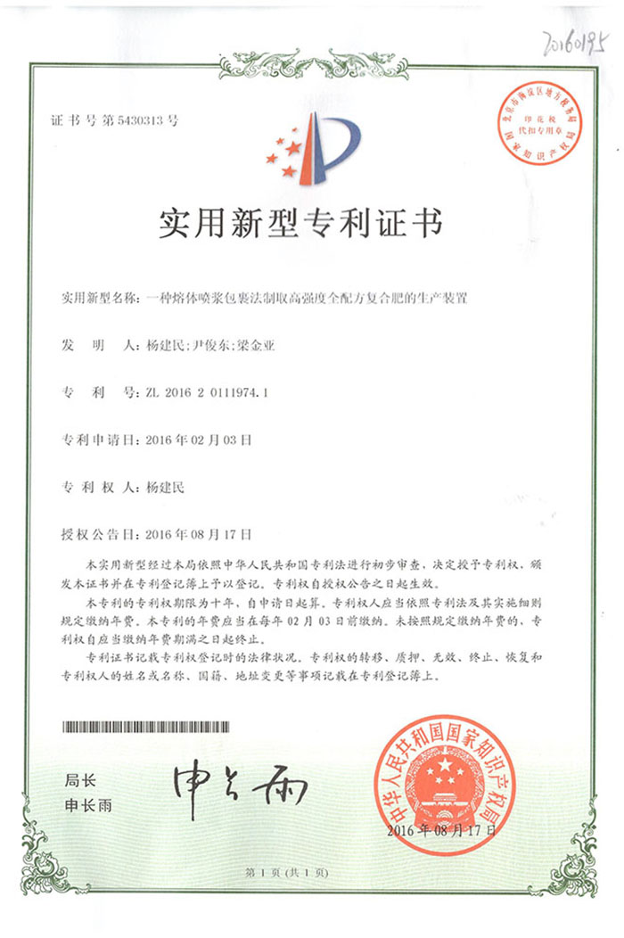 熱烈祝賀我公司又取得一項專利《一種熔體噴漿包裹法制取高強(qiáng)度全配方復(fù)合肥的生產(chǎn)裝置》
